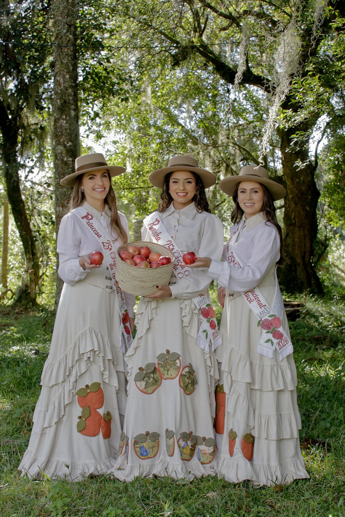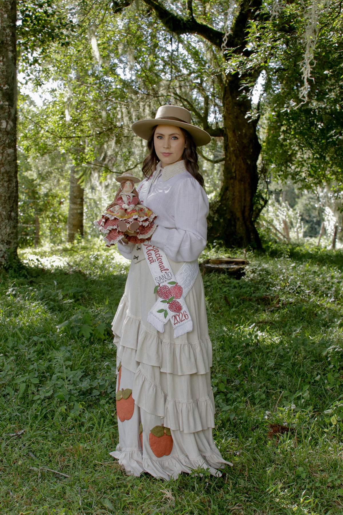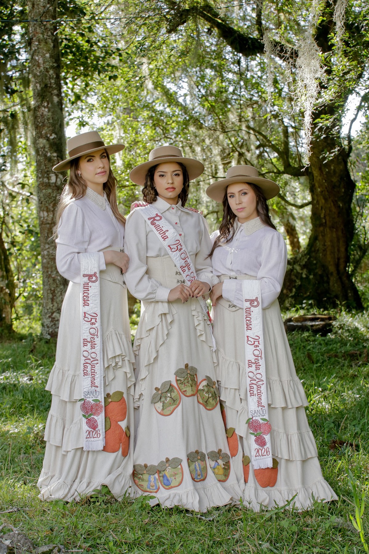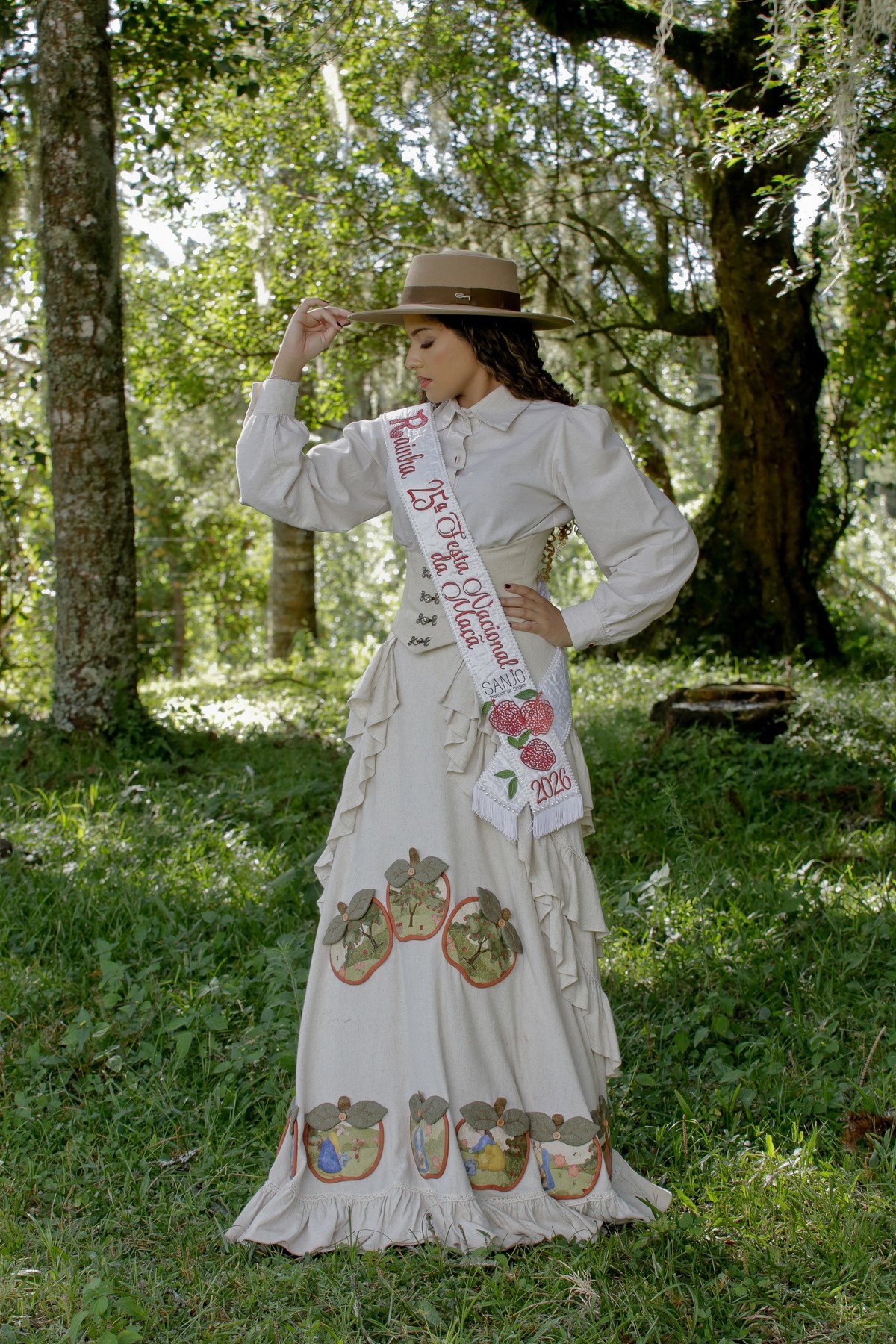 A vestimenta expressa a alma do campo, das macieiras e da identidade cultural de São Joaquim. Produzido com tecidos da coleção Macieiras, o traje traz elementos que remetem diretamente à natureza, ao trabalho manual e à trajetória histórica que liga a Festa da Maçã às suas raízes. Cada detalhe foi cuidadosamente pensado para enaltecer o feito à mão, os símbolos do território e a suavidade que representa a força do interior.