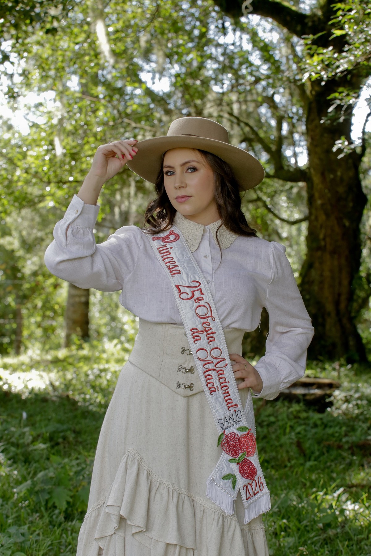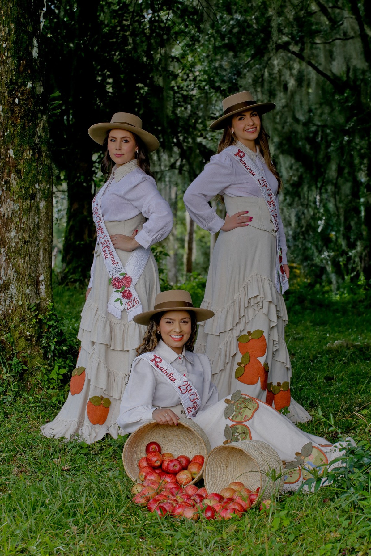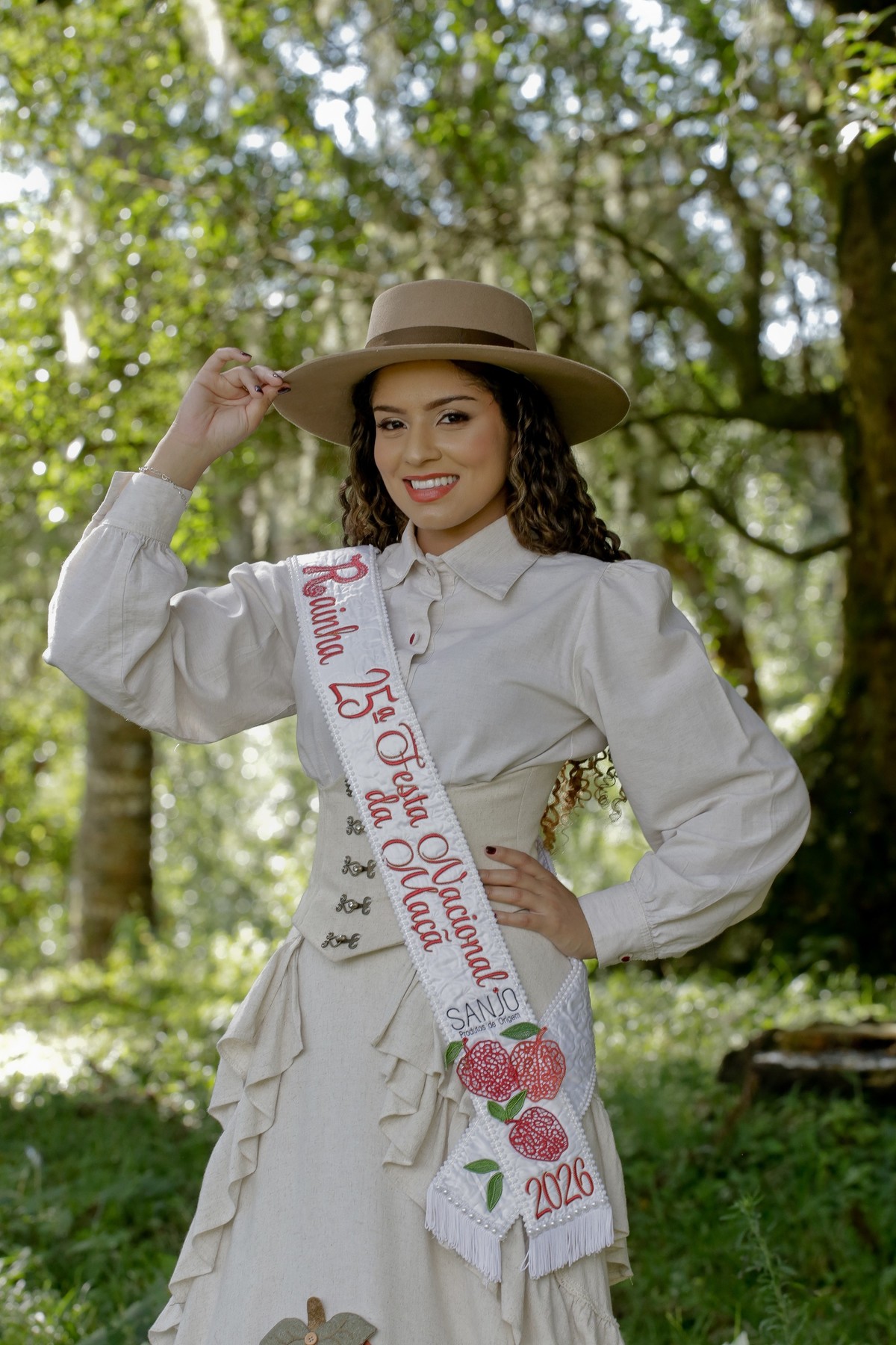 A vestimenta expressa a alma do campo, das macieiras e da identidade cultural de São Joaquim. Produzido com tecidos da coleção Macieiras, o traje traz elementos que remetem diretamente à natureza, ao trabalho manual e à trajetória histórica que liga a Festa da Maçã às suas raízes. Cada detalhe foi cuidadosamente pensado para enaltecer o feito à mão, os símbolos do território e a suavidade que representa a força do interior.