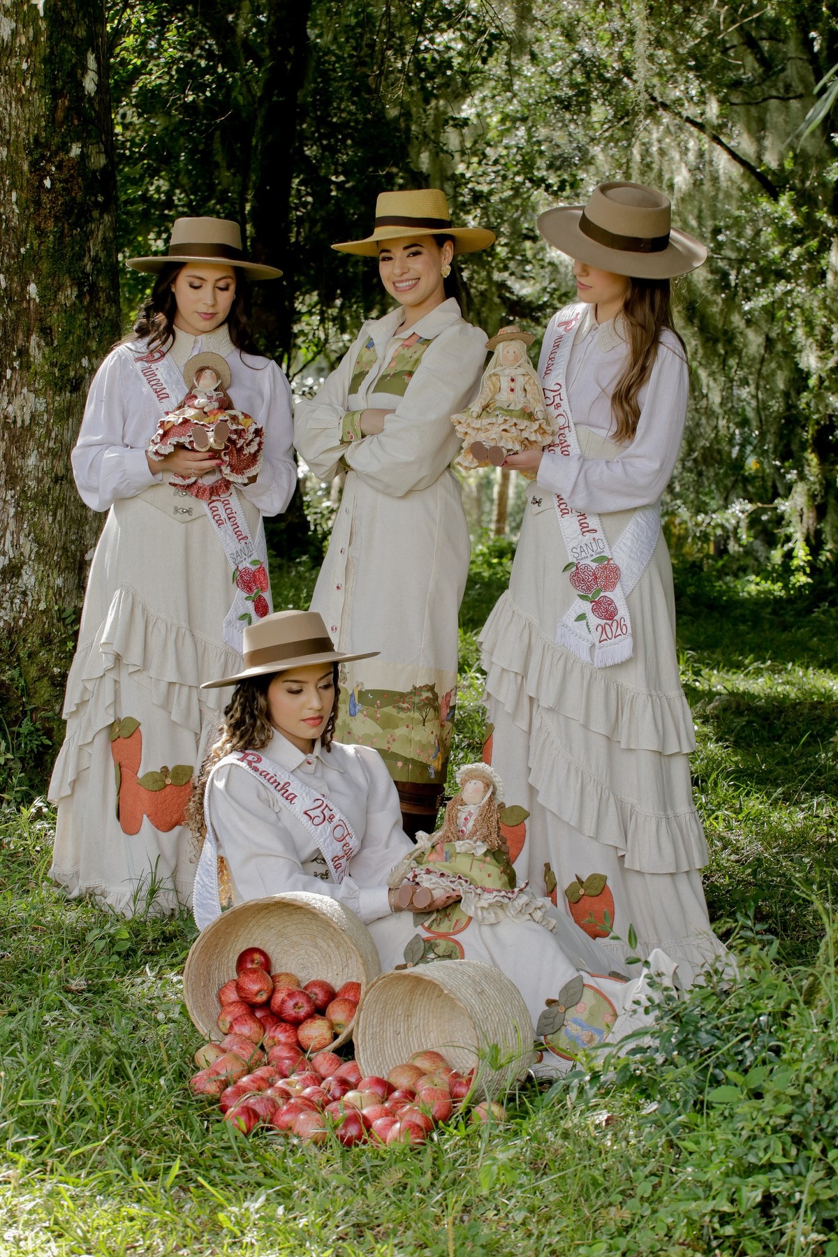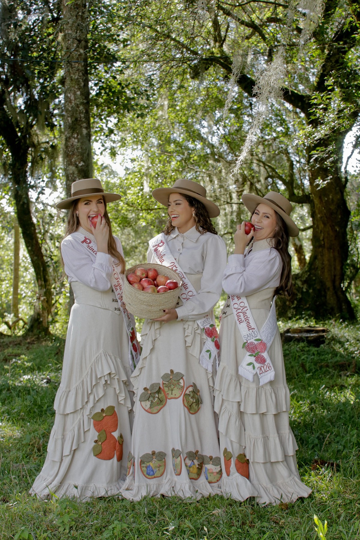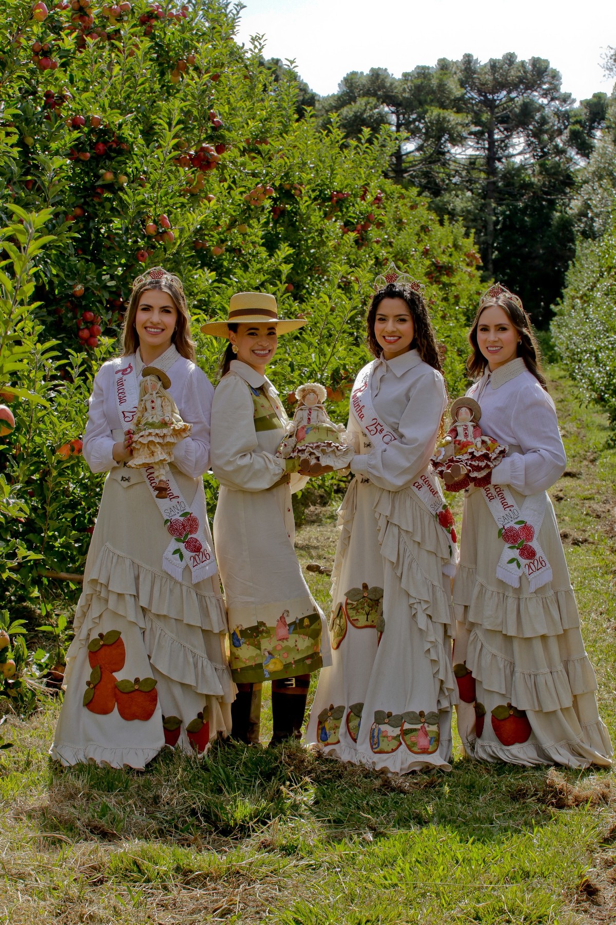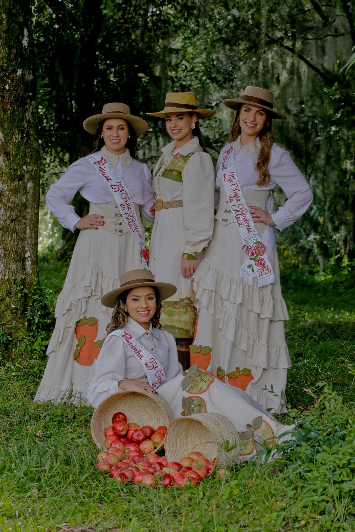 A vestimenta expressa a alma do campo, das macieiras e da identidade cultural de São Joaquim. Produzido com tecidos da coleção Macieiras, o traje traz elementos que remetem diretamente à natureza, ao trabalho manual e à trajetória histórica que liga a Festa da Maçã às suas raízes. Cada detalhe foi cuidadosamente pensado para enaltecer o feito à mão, os símbolos do território e a suavidade que representa a força do interior.